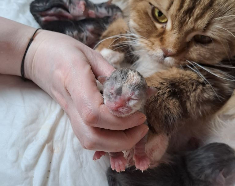 Die Tore zur mystischen Schattenwelt haben sich am 28.02.2026 geöffnet und 5 süße, kleine Dämönchen zu uns auf die Welt geschickt. Wir waren überhaupt nicht darauf vorbereitet! Erst in einer Woche waren unsere little demons ausgezählt und als die Geburt nun - viel zu früh - losging, waren wir wirklich mehr als besorgt. Viele Kitten, die so früh geboren werden sind nicht vollständig entwickelt und haben oft keinen Saugreflex und nicht die besten Überlebenschancen. Nani hat auch ungewöhnlich lange für das erste Kitten gebraucht, war aber dennoch souverän und entspannt wie immer. Unsere Supermama! Als das erste kleine Würmchen dann geboren war, war uns klar, was die verfrühte Geburt ausgelöst hatte. Leider kam das kleine Männlein tot zur Welt und auch nach 40 Minuten Wiederbelebungsversuchen konnten wir den kleinen Engel leider nicht retten. Wir veruten, dass er schon eine Zeit lang nicht mehr gelebt hatte. Nach diesem hatten wir erst wirklich Angst um die anderen Kitten, aber es war wie ein Wunder. 4 weitere, putzmuntere Kitten mit wirklich ERSTAUNLICHEN Gewichten wurden geboren. Alle trinken selbstständig und sind zwar noch ein bisschen kleiner als unsere sonstigen Kitten, aber munter und wunder-wunderhübsch!!!! Wir waren so erleichtert und haben wirklich Tränen der Freude geweint über dieses Glück Unglück. Dennoch füttern wir die Kleinen aktuell natürlich zu, um sie im Wachstum zu unterstützen. Auch wenn der kleine Quin es nicht geschafft hat, sind Neron, Kikimora, Samara und Malacai wohlauf und Nani kümmer sich wie immer mit einer Liebe und Freude um sie, die absolut einzigartig ist! Die D-chen haben uns darüber hinaus endlich Verdünnungen geschenkt, Blue, Black, Silber, White und Torbie sind dabei und zeichnen einen traumfaft schönen, bunten Wurf! Wir freuen uns sehr, die wunderbaren kleinen Charaktere näher kennenzulernen und auf ihrem Weg begleiten zu dürfen.